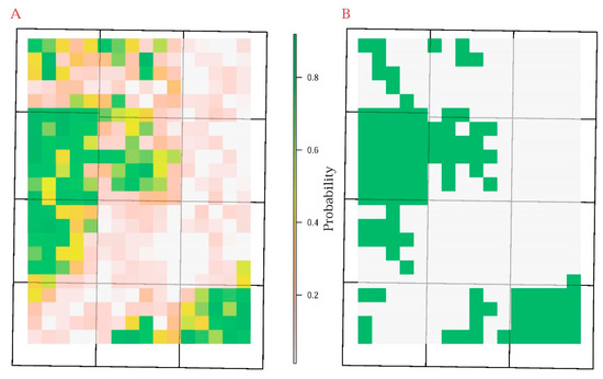 Classification (at 166 m resolution) giving the probability that the forest is intact based on 2012 LiDAR data (A). Intact forest (green) and logged forest (grey) at the Fazenda Cauaxi based on logging records by IFT (B).