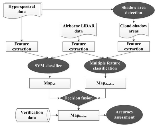 The flowchart of urban object extraction from shadow areas with the fusion of airborne light detection and ranging (LiDAR) and hyperspectral data.