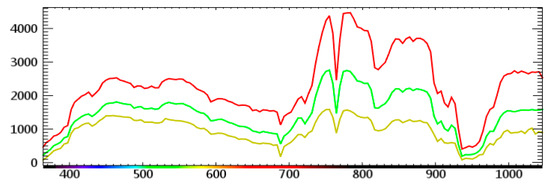 Spectral curve of vegetation in shadow areas. Here, red/green/yellow lines represent max/mean/min values of hyperspectral data, respectively. The longitudinal axis represents radiance, and the transverse axis represents wavelength (nm).
