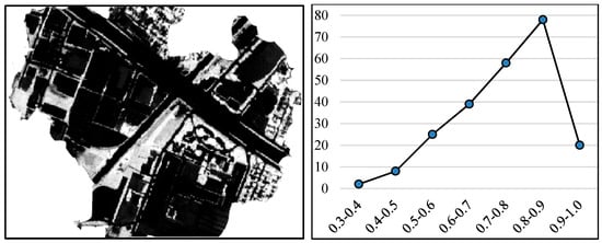 Normalized difference vegetation index (NDVI) imagery of the shadow area (left) and the distribution of vegetation samples in different intervals of the NDVI (right). Here, longitudinal and transverse axes represent the number of samples and NDVI, respectively.