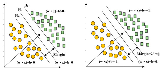 Optimal classified hyperplane (left) and Normalization Optimal classified hyperplane (right).