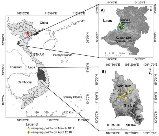 Locations of the soil sampling sites in Vietnam: (A) Locations of the 13 sampling points in Nam Can commune, Ky Son district, Nghe An Province; (B) locations of eight sampling points in the Kon Tum and Gia Lai Provinces, the northern part of the Central Highlands of Vietnam.
