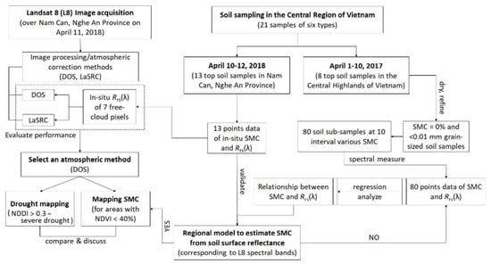 Flowchart of the methodology to estimate and map the soil moisture content (SMC) over the Central Region of Vietnam, using Landsat 8 (L8) images.