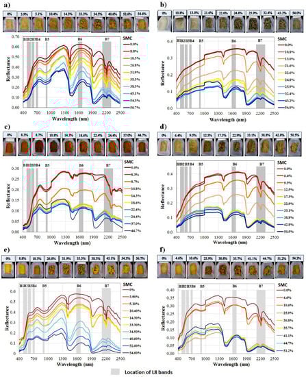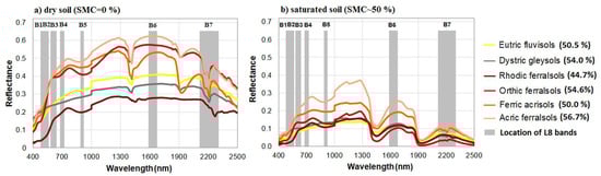 In all of the soil type samples, the spectral trough at the B7 location was clearly presented, and it increased inversely with SMC. Similarly, the trough within B5 was not clearly presented in several cases, i.e., in dystric gleysols (Figure 4b) and eutric fluvisols (Figure 4d) samples, but the inverse trend between Rrs(λ) and SMC was also shown in all cases. The spectral peak located with the same location of B6 was also presented clearly in all cases, but the inverse trend between Rrs(λ) and SMC was apparent in several cases, particularly near the saturation and saturation states of dystric gleysols, rhothic ferrasols, and ferric acrisols soil samples (Figure 4b,c,f). The strong correlations of detected SMC with B5, B6, and B7 in each soil sample from this study (Table 3) can help us to understand why these bands or spectral regions have been used for estimating SMC from satellite data in the preceding works [].