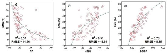 The fit-curve regressions of SMC and Rrs(λ) corresponding to: (a) the L8 SWIR-2 band, B7; (b) NSMI (calculated by (B6−B7)/(B6+B7)); c) the L8 spectral ratio of the NIR band (B5) versus the SWIR-2 band, B5/B7, using data measured from 80 soil sub-samples. The best fit of the exponential curve to the relationship of SMC and B5/B7, which is (c) indicates the appropriateness of this band ratio for estimating SMC by using L8 data.