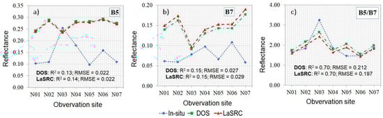 Comparisons of in situ Rrs(λ) and retrieved Rrs(λ) corresponding to (a) the L8 NIR band (band 5: B5), (b) the L8 SWIR-2 band (band 7: B7), and (c) the spectral ratio corresponding to B5/B7, obtained via two atmospheric correction methods: DOS and LaSRC. While the retrieved Rrs(λ) of B5 and B7 indicates significant biases with respect to in situ Rrs(λ), the retrieved B5/B7 (c) demonstrates a smaller dependency of the data on atmospheric correction, and it is consistent with in situ data, and therefore suitable for use in SMC estimation.