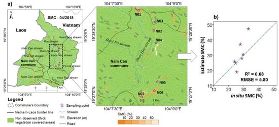 Validation result of L8RSM for estimating SMC using in situ SMC and estimating SMC of seven sampling points in Nam Can Commune: (a) Locations of seven sampling points overlaid the estimated SMC map obtained from using the L8RSM and L8 scene taken over the Nam Can Commune on sampling date, 11 April 2018; (b) scatterplot showing the comparison of in situ and estimated SMC at seven sampling points. The reasonable error (RMSE = 5.8) corresponding to 20% of the mean of the in situ SMC indicating the suitability of L8RSM for estimating and mapping SMC using the L8 images.