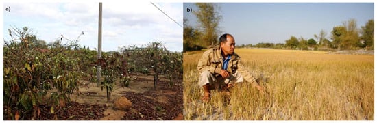 Images of agricultural products damaged by the drought in March 2016: (a) Coffee trees in a farm in the Ia Grai district, Gia Lai Province were shriveled up, due to a lack of irrigation during the drought []; and (b) a farmer in Gia Lai Province on his rice farm with yield losses [].