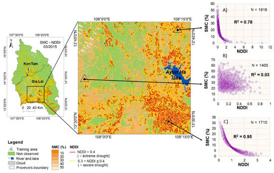 Map of the retrieved NDDI-overlaid estimated SMC from L8 images acquired over the northern part of the Central Highlands of Vietnam in March 2015, which demonstrates the spatial relationship between these two variables: (A) within the area, 20–30% is dense vegetation coverage; (B) within the area, more than 40% is dense vegetation coverage; (C) within the area with lower than 20% dense vegetation coverage.