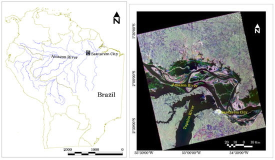 The study area is part of the lower Amazon floodplain in the State of Pará, Brazil (Figure 1) consisting of a complex Amazon river network, lakes and floodplains. The lower Amazon floodplain is classified as várzea, a type of floodplain that are periodically flooded by sediment-rich white-water rivers of the Amazon [2,37]. The level of water in the area varies seasonally throughout the year in response to the spatial and temporal distribution of rainfall in the Amazon catchment [38]. These seasonally fluctuating water levels are known as ‘flood pulses’ [1,2]. These flood-pulses [2] are different for most of the wetlands in tropics, sub-tropics, and temperate region. The average amplitude of flood pulses can exceed 10 m in the Amazon River, depending on the location and the amount of rainfall [1]. Based on [1], mean flood pulse amplitude at the Santarém station (Figure 1) in the study area is about 4 m with a maximum water level in June and a minimum in November.