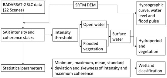 Our previous research demonstrated that high resolution (1–5 m) C-HH data were well suited for interferometry [41]. Based on that, extra fine mode (XF0W2) right looking ascending pass RADARSAT-2 C-HH data were acquired in 2014-2016 covering 139 x 71 km2 of Amazon floodplain centered 54.9017° W, 2.1173° S. All 22 scenes of XF0W2 Single Look Complex (SLC) data were acquired (Table 1) with an incident angle of about 35° and a pixel spacing of 2.6 m in range and 2.5 m in azimuth in slant range projection. Besides, Shuttle Radar Topography Mission (SRTM) 1 void filled elevation data at a resolution of 1 arc-second (30 meters) was used for orthorectification and further analysis (https://lta.cr.usgs.gov/SRTM1Arc). As shown in Figure 2 these data sets were processed and used for extracting wetland boundary, surface water/inundation extent, flood pulse, hydroperiod, and wetland vegetation.