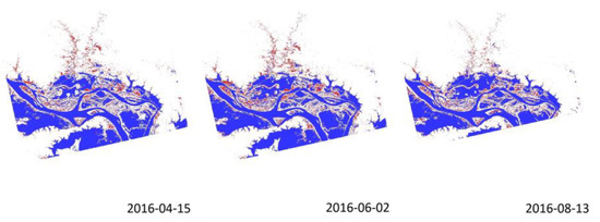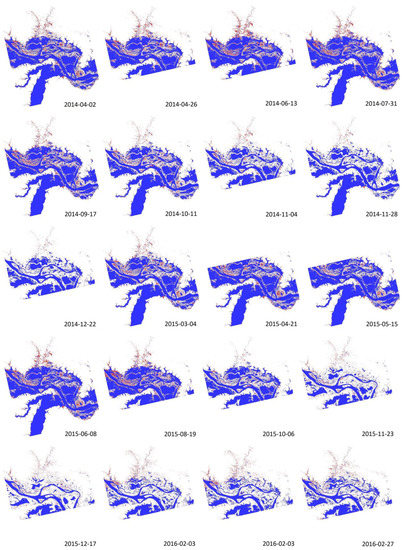 Radar-derived surface water maps (open water is in blue and flooded vegetation in red) from April 2014 to August 2016. These images were produced using an intensity thresholding approach and captured the dynamic changes in surface water extent.