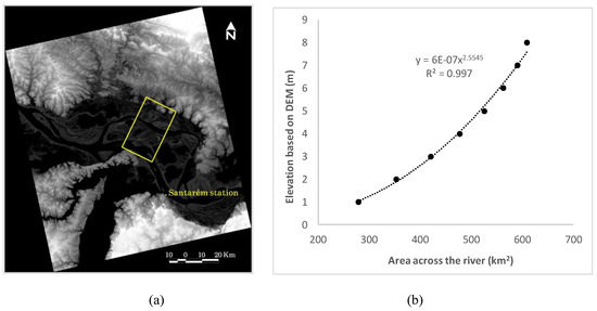 As the flood pulse of a specific location is an important indicator for hydrology and biodiversity, we estimated the flood pulse using surface water products derived from remote sensing. For that, the elevation of the water level was estimated from the surface water extent assuming a flat water surface. This is based on the hypsographic curve [48] showing the relationship between the elevation and the area less than the particular elevation of the selected cross section area (Figure 4a) of the river valley using the SRTM DEM. Figure 4b shows the relationship that was used to estimate the water level from the surface water extent.