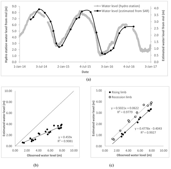 (a) Temporal pattern (annual flood pulse) of the estimated water level from surface water maps derived from SAR and observed hourly water level measurement acquired form Santarém station. (b) Correlation and deviation between estimated and observed water levels. (c) Correlation between the estimated and observed water level at rising and recession limbs.