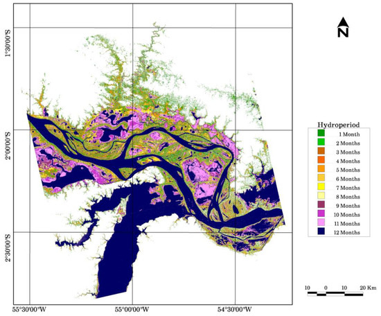 In temporary freshwater ecosystems, hydroperiod (inundation duration) is commonly found to be one of the fundamental factors affecting community structure and it is generally found that species richness increases with inundation duration [49]. As inundation duration increases, larger and longer-lived species can be supported and it also favors the expansion of the coverage area of floating herbaceous vegetation [37]. Figure 6 is a hydroperiod map developed from the surface water maps, which includes open water and flooded vegetation (Figure 3). This was created based on the frequency of the number of times a pixel is identified as water in the multiple surface water maps. Then the frequency (1-22) was converted to months (1-12) assuming the surface water maps are equally spaced in time for simplifying interpretation. This assumption will be more valid when we use very frequent SAR data from forthcoming RCM satellites. This map can be used for understanding wetland functions and for applying models of wetland functions, where the temporal and spatial extent of wetland flooding should be characterized in terms of hectare-days [42]. Figure 7a which was derived from Figure 6 area statistics shows such values (area is in gray: km2-months) of the study area and can be used for such models.