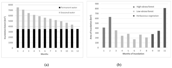This map can also be used for the zonation of plant communities described in [37]. According to Ferreira’s zonation [37], the vegetation zonation along the hydroperiod and flood-level gradient on várzea floodplains are well characterized. Central Amazonian várzea forests are divided as high várzea or low várzea, with few species found in both forest types. High várzea forests are found on more stable sites, where the flood period is generally < 50 days per year and the water level is <3 m. Low várzea forests become established where the annual water column has an average height of >3 m, which corresponds to an inundation period of 50 to 270 day per year. The herbaceous vegetation is subjected to average annual flooding of 8–9 months. Figure 7b which was derived from Figure 6 shows the area statistics of wetland vegetation of the study area based on the Ferreira’s zonation. Although, the vegetation composition of the várzea floodplain depends on the duration and amplitude of flooding, the derived three zones are not detailed enough to categorize the actual wetland vegetation.