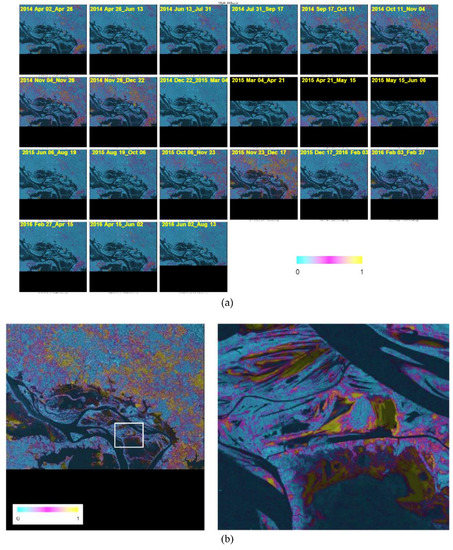 (a) Twenty-one coherence products from 22 RADARSAT-2 scenes (b) Coherence of 23 November and 17 December 2015 scenes.