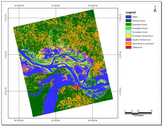 Figure 10 provides a map of wetland extent and vegetation type of the study area classified from the above six statistical products derived from RADARSAT-2 intensity and coherent stacks. The extent of the wetland visually matches with the classified image [44] that was the first validated estimate of wetland derived from the Global Rain Forest Mapping Project (GRFM) Amazon low-flood and high-flood seasons mosaics. However, our classification is comprehensive as we have used very high resolution multi-temporal intensity and coherence data for the classification. The accuracy assessment was performed as a standard error matrix (Table 2) with the help of the land cover information of 200 random validation points interpreted from Google earth and Bing maps and pan-sharpened Landsat TM images.