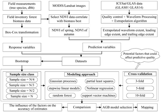 Although many studies of forest AGB estimation have been conducted, substantial uncertainties remain in the current estimations. In this study, we analyzed the effects of the prediction method (six cases), sample size (four cases), and cross-validation (three cases) on the prediction quality of forest AGB estimation from LiDAR and optical remote sensing data. We generated subsamples using stratified bootstrapping. The ANOVA method was used to rank the importance of the three factors on the accuracy of the biomass predictions reflected in the computed diagnostics (RMSE and R2).