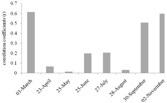 Correlation coefficients (r) between biomass and NDVI on different dates.
