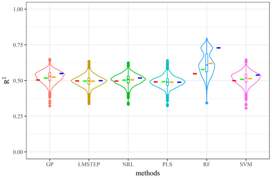 The modeling accuracy results of the six prediction methods created with different cross-validation settings are presented in Figure 7 and Figure 8. The violin plots in Figure 7 and Figure 8 illustrate the distribution of R2 and RMSE values, respectively, from the 500 bootstrapped models as obtained by 3-fold, 5-fold, and 10-fold cross-validation for each method using the class 4 dataset. The median values of R2 or RMSE for 3-fold, 5-fold, and 10-fold cross-validation are presented from left to right in red, green and orange horizontal stripes. In most cases, a larger number of folds led to an obvious increase in R2. However, the difference in RMSE resulting from the different number of folds was very small (Figure 8).