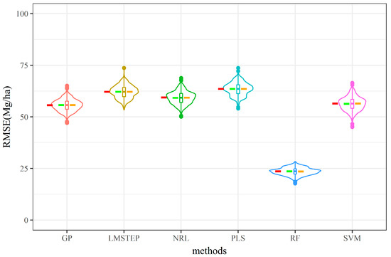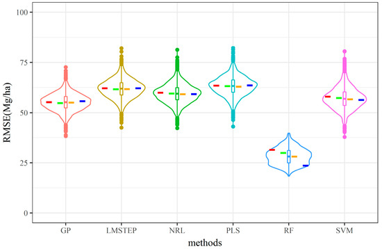Figure 4 and Figure 5 summarize the model performance obtained from all model runs. The violin plots in Figure 4 illustrate the distribution of the R2 values obtained by five-fold cross-validation for the six methods. Each of the methods had four sample size classes. The R2 values for each of the four sample size classes were obtained from 500 bootstrapped models. The median R2 values for each of the four sample size classes are presented with colored horizontal stripes. Class 1 to 4 from left to right are shown in red, green, orange, and blue respectively. The violin plots in Figure 5 illustrate the distribution of the RMSE values, and explanations follow those for Figure 4. A comparison of the six prediction methods indicated that RF provided more accurate AGB estimates than the other five methods, especially when a larger sample size was available. Concerning the sample size, a stable increase in accuracy and decrease in RMSE were observed along with an increasing number of sample units (colored horizontal stripes from left to right). Exceptions were the RMSE values of the GP and PLS methods, where a slight increase in RMSE was observed when switching from class 3 to class 4 with the largest number of sample units. The absolute differences in R2 and RMSE between RF and the second model ranged from 0.04 and 23.78 Mg/ha (class 1, second model GP) to 0.18 and 32.16 Mg/ha (class 4, second model GP). The absolute differences in R2 and RMSE between RF and the least accurate prediction model (PLS) were 0.24 and 40.02 Mg/ha, respectively. GP and SVM produced larger R2 and smaller RMSE when compared to NRL, PLS, and LMSTEP in most cases.