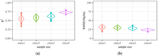 Modeling accuracy results from random forest (RF) AGB models with different sample size (class1 = n/4, class2 = n/3, class3 = n/2, class4 = n, n = 801) for (a) R2 and (b) RMSE.