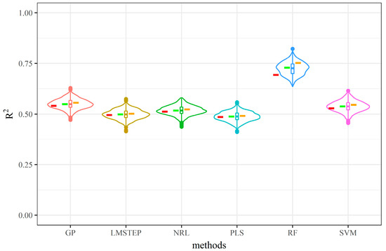 The performance of the six prediction methods was compared in this study, including three parameter methods (LMSTEP, PLS, and NRL) and three nonparametric methods (GPs, RF, and SVM). Among the parameter methods, LMSTEP and PLS are classified as linear regression and NRL is classified as nonlinear regression. RF provided the greatest estimation accuracy in terms of the largest R2, the smallest RMSE, and the smallest relative error, especially when a larger sample size was used. This result complements those of other studies [10,40,57,58]. One of the main advantages of RF is its flexibility due to its conceptual design, which differs from all the other five models. A downside of RF may be that when a small size sample is applied in the algorithm, the variance of estimates is considerable. An increase in sample size can lead to a reduction in the range of variation. Among the three nonparametric algorithms in this study, GPs generated suboptimal predicted results in terms of R2, RMSE, and relative error. The SVM showed the least favorable accuracy, which is consistent with the conclusions from recent studies [59,60].