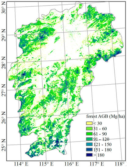 The spatial distribution of forest AGB over the study area is shown in Figure 9, which was obtained using the RF model with the largest number of sample units. The forest AGB density was distributed mainly within the 60–180 Mg/ha. Figure 9 shows clear spatial patterns in the study area of the AGB values. Greater AGB values were distributed in South and Northeast Jiangxi, which are mountainous areas. The total AGB of all forest types estimated with RF was 9.19 × 108 Mg in Jiangxi Province. A comparison between the different forest types showed that the evergreen broadleaf forest had the largest mean AGB value (112.57 Mg/ha). Evergreen needle-leaf and deciduous needle-leaf forests had smaller mean AGB values (32.40 and 25.63 Mg/ha, respectively), and the least AGB estimates were found in shrubland (15.25 Mg/ha).