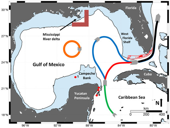- Johnston, M.W.; Bernard, A. A bank divided: Quantifying a spatial and temporal connectivity break between the Campeche Bank and the northeastern Gulf of Mexico. Mar. Biol. 2017, 164. [Google Scholar] [CrossRef]