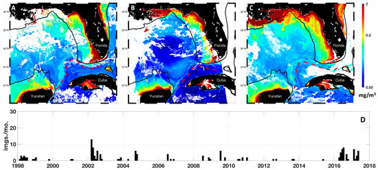 - Nababan, B.; Muller-Karger, F.E.; Hu, C.; Biggs, D.C. Chlorophyll variability in the northeastern Gulf of Mexico. Int. J. Remote Sens. 2011, 32, 8373–8391. [Google Scholar] [CrossRef]