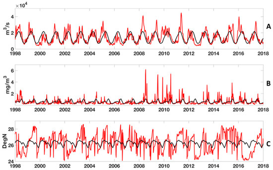 - Ortner, P.B.; Lee, T.N.; Milne, P.J.; Zika, R.G.; Clarke, M.E.; Podesta, G.P.; Swart, P.K.; Tester, P.A.; Atkinson, L.P.; Johnson, W.R. Mississippi River flood waters that reached the Gulf Stream. J. Geophys. Res. 1995, 100, 13595–13601. [Google Scholar] [CrossRef]