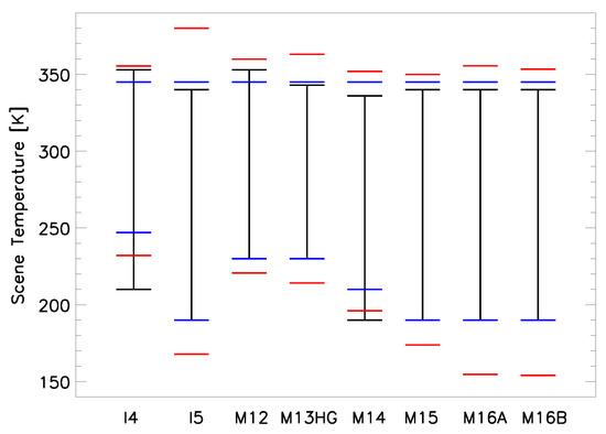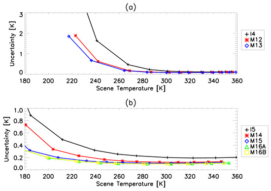 The two largest individual contributors to the total uncertainty for the MWIR bands are and . The uncertainty was roughly constant with scene temperature at about 0.2–0.3% and was the dominant contributor above about 290 K for bands M12 and M13 and above about 320 K for band I4. The was smaller at high scene temperatures and rises rapidly as the scene temperature decreases where it was the dominant contribution. The was driven by statistical uncertainty, so when a large data set is used this contribution will be reduced. In this case, the uncertainty will dominate down to scenes of 260–270 K where the uncertainty becomes the largest contributor (which then rises rapidly as the scene temperature decreases). This effect will reduce the uncertainty for band M12 at 230 K in Table 5, thereby satisfying the requirement.