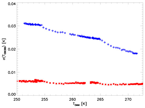 The OBCBB was kept at about 292 K for most of thermal vacuum testing (see Table 2) and has six thermistors embedded in the back. The standard deviation of the six thermistor readings was used to track the uniformity of the OBCBB temperature as seen by VIIRS (the design requirement was less than 30 mK). Figure 2 plots this standard deviation versus the instrument temperature. For JPSS-2 VIIRS (shown in blue), the standard deviation was as high as 31 mK and decreases with instrument temperature to around 18 mK. The sensor vendor traced the root cause to the bonding of the heater to the back of the blackbody. The comparable pre-launch measurements of the JPSS-1 VIIRS OBCBB uniformity are shown in red, and are around 5–7 mK over the entire temperature range. Based on SNPP and JPSS-1 VIIRS experience, the instrument temperature on-orbit is around 260–265 K. This nonuniformity will be in addition to the expected day/night cycle observed in earlier VIIRS instruments on-orbit [1,3] of up to about 30 mK (under nominal operating conditions at 292 K during daytime). This expected JPSS-2 non-uniformity of up to 50–60 mK could potentially lead to biases in the MWIR bands of up to 0.2% and in the LWIR bands of up to 0.1%.