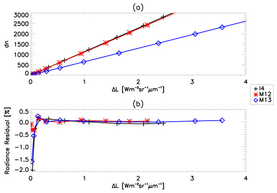 Fits of the offset corrected detector response to the path difference radiance are shown in Figure 3a for detector nine of the MWIR bands using BCS data (the corresponding radiance residuals are shown in Figure 3b). These detectors were representative of all the detectors in a given band. A significant portion of the 12 bit analog-to-digital converter range was used (about 75%). The radiance residuals were small except at very low radiances where the residuals increase (up to ∼4%); for this spectral region, a 230 K scene produces very low radiances and is therefore a large constraint on the fitting (due to noise uncertainty). This behavior is also observed at around 355 K for M13 low gain (the low end of its dynamic range). Figure 4a,b show the same plots for the LWIR bands. The majority of the 12 bit analog-to-digital converter range was used (above 90%) for these bands. The radiance residuals are very small over the entire radiance range for all of the LWIR bands (less than 0.2%), except band M14 where there is a small increase at the lowest radiance level (still less than 1.0%). The data shown in the figures was measured during the nominal instrument temperature plateau with the FPA at 82 K, but the results measured at other instrument conditions (temperature plateaus, FPA temperatures, HAM sides, and electronics sides) were generally consistent in terms of the fitting behavior and residuals. In addition, the comparable measurements made during the JPSS-1 VIIRS test campaign also showed similar behavior to the current results [12].