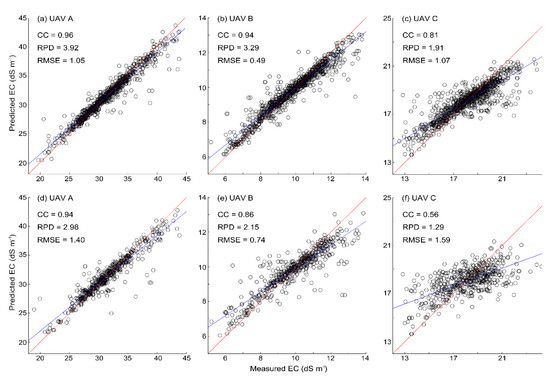 Scatter plots of measured versus predicted electrical conductivity (EC)-derived from RF regression models using UAV data for the field A (a,d), B (b,e), and C (c,f); the upper three (a–c) are the training results; the lower three (d–f) are the validation results; the blue lines are the fitted lines and the red lines are the 1:1 lines.