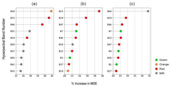 Variable importance measured by percentage increase in mean squared error (MSE) for the UAV-derived prediction models of field A (a), B (b), and C (c).