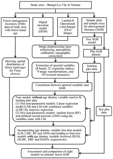 In Figure 1, the methodologic framework of this study is illustrated, consisting of the following steps: 1) the selection of the study area; 2) the collection of the sample plot and tree biomass data; 3) the calculation of the tree and plot AGB; 4) the acquisition, preprocessing, and analysis of the Landsat 8 OLI images; 5) the development of the models by incorporating the age dummy variable; and 6) the assessment and comparison of the forest AGB predictions from the models with and without the age dummy variable.