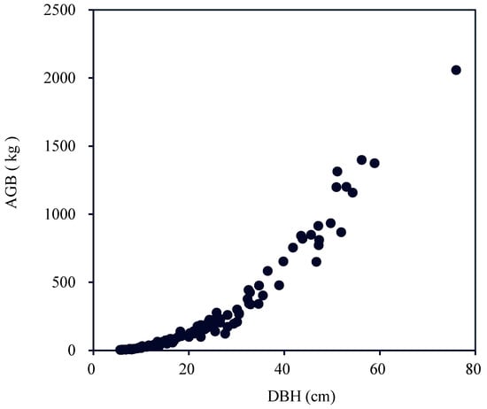 The AGB data of the individual sample trees (Unit: kg) were fit using a power function, and the AGB of each plot (Unit: Mg/ha) was summed using following Equation (1).