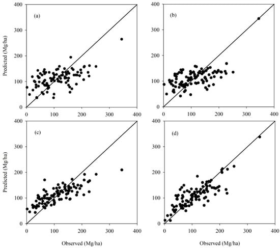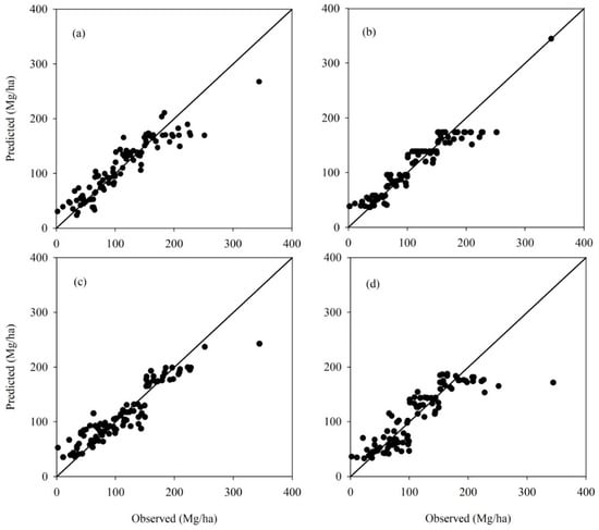 The scatter plots of the predicted plot AGB values against the observed values based on the modeling dataset (n = 100): (a) the linear regression with the age dummy variable (DLM); (b) the linear models considering combined variables and the age dummy variable (DLMC); (c) the artificial neural network with the age dummy variable (DANN); and (d) the random forest with the age dummy variable (DRF).