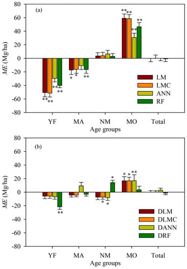 The statistical test results of the significant differences of mean errors from zero: (a) for the models without the age dummy variable and (b) the models with the age dummy variable (LM: linear regression, LMC: linear models considering combined variables, ANN: artificial neural network, RF: random forest; DLM: LM with the age dummy variable, DLMC: LMC with the age dummy variable, DANN: ANN with the age dummy variable, DRF: RF with the age dummy variable; YF: young forest, MA: middle-age forest, NM: near-mature forest, MO: mature and overmature forest; * and ** represent the significance levels of 0.05 and 0.01, respectively).