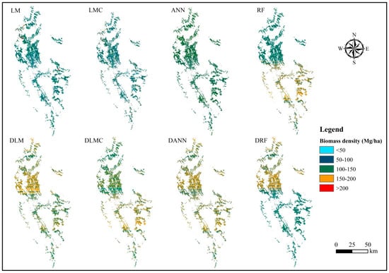 The spatial distributions of the predicted aboveground biomass (AGB) values of the Pinus densata forests using eight models (LM: linear regression without the age dummy variable, LMC: linear models considering combined variables without the age dummy variable, ANN: artificial neural network without the age dummy variable, RF: random forest without the age dummy variable; DLM: linear regression with the age dummy variable, DLMC: linear models considering combined variables with the age dummy variable, DANN: artificial neural network with the age dummy variable and DRF: random forest with the age dummy variable).