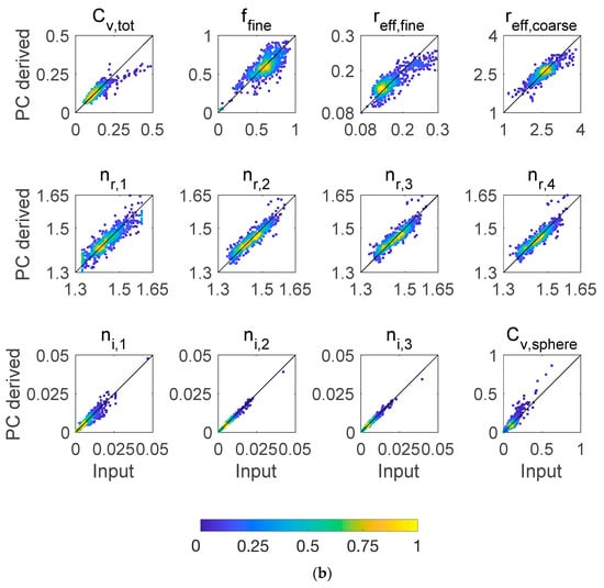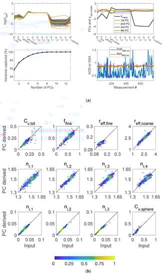 (a) Top left panel: AERONET inversion of aerosol fields and properties (in natural logarithm space) including total volume concentration (), fraction of fine mode aerosols (), effective radii of fine () and coarse () mode aerosols, column effective real part of refractive indices () at 0.439, 0.675, 0.870, and 1.018 μm, respectively, imaginary part of refractive indices (), and spherical particle volume concentration (). Though not specified by use of legend, each color is associated with an independent set of retrieval parameters. Top right panel: spatial and temporal mean of all retrievals and the first four principal components (PCs). Bottom left panel: percentage variance of the aerosol fields captured by PCs, indicating that 41%, 62%, 77%, and 85% of variance is captured by the first one, two, three, and four PCs, respectively. Bottom right panel: Aerosol optical depth (AOD) and single scattering albedo (SSA) at 440 nm that are reported in the AERONET retrievals analyzed here. (b) Regression of the derived aerosol properties from four PC against input AERONET values. The scatter plot is colored by the density of the points. Each panel corresponds to a specific aerosol property indicated in the title.