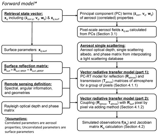 To preserve generality of the approach, we use the symbol in the notations below to denote a column vector containing an arbitrary set of parameters that have correlation with each other. In the specific implementation of the correlated multi-pixel inversion for AirMSPI aerosol remote sensing (Section 5), we specify the correlation to be among aerosol parameters only, while the surface parameters are uncorrelated with each other or with aerosol properties (though in principle these assumptions could be relaxed [21,22,23]). Utilization of the aerosol correlations enables development of a fast PC-RT model for TOA radiance and polarization calculation over a group of pixels (Section 4).