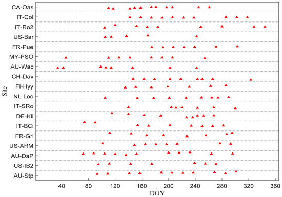 We included five vegetated land surface types in this study: Deciduous broadleaf forest, evergreen broad-leaved forest, evergreen coniferous forest, grassland, and farmland. Three sites were subjected to validation for each land surface type. The results are shown in Figure 5.