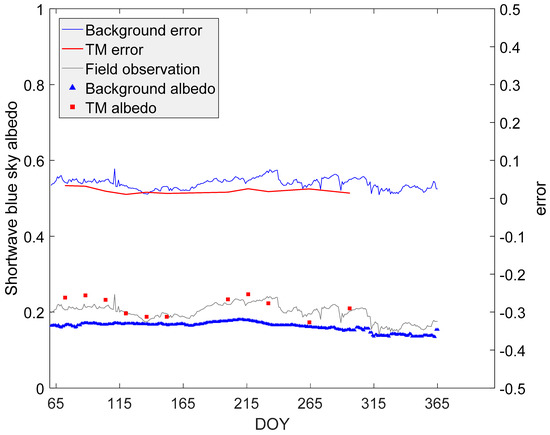 The accuracy of inversion is affected by the accuracy, quantity, and time distribution of TM data, where quantity and time distribution complement each other. In this study, we used L1T data with less than 10% cloud contamination for our estimations. There were approximately 5–11 TM data points available at the selected sites, which was sufficient for albedo estimation by data assimilation. If the quantity of available TM data in one year falls below 5 points, the albedo during the time series may not be updated for long periods of time, and the accuracy of the estimations degrades. Several high-quality observations are needed to ensure accurate estimations. Other high-resolution satellite images such as HJ1A/B or Sentinel-2 can be supplemented to resolve this problem for those areas where high-resolution observations are limited.
