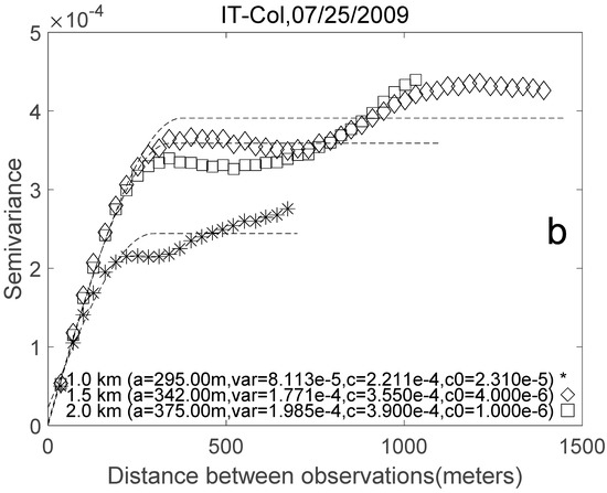 The range defines the distance from a point beyond which there is no further correlation of a biophysical property associated with that point. It has also been described as the average patch size of the landscape when the curve reaches the high-level distance [40]. The data are correlated within the range of . Otherwise, the data are not correlated with each other; that is, the observations outside the range do not affect the estimation results. For a 1.0 km2 subset amax = 690 m, for a 1.5 km2 subset amax = 1050 m, and for a 2.0 km2 subset amax = 1410 m. The sill is the variation of ordinates when the abscissa is greater than the variable range. The nugget is the variation of the abscissa at 0, which describes the variability of the data at the microcosmic level.