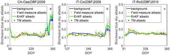 As shown in Figure 6, RMSEs of the estimated albedos in deciduous broadleaf forest (DBF), evergreen broadleaf forest (EBF), evergreen needleleaf forest (ENF), cropland (CRO), and grassland (GRA) were 0.0152, 0.0085, 0.0087, 0.0152, and 0.0109; the values were 0.5980, 0.7061, 0.9190, 0.8191, and 0.6911, respectively. The RMSEs for all land surface types were less than 0.02, which meets the requirements of global and regional climate models [53]. The correlation coefficients between the estimated surface albedos and the surface measurements were high ( > 0.6). The estimation results were close to the line . The accuracies of ENF and CRO were the highest among all land surface types with values of 0.9190 and 0.8191, respectively. The lowest value was 0.5980 for DBF, which can be attributed to the dispersion of TM data (Figure 1). At ENF and CRO sites, the distribution of TM data was more uniform across the whole time series. At the DBF site, there was a slightly longer period of missing data which prevented the albedo from being updated in a timely manner. The estimation accuracy depended on the temporal distribution of the available TM data at a certain degree, as temporally uniform distributed TM data led to higher estimation accuracy. Nevertheless, the proposed algorithm greatly improves the estimation accuracy compared to field observation alone.