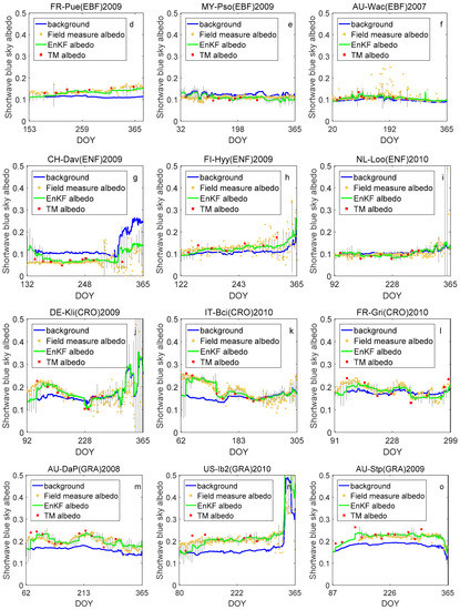 Time series albedo estimations based on EnKF for DBF (a–c), EBF (d–f), ENF (g–i), CRO (j–l), GRA (m–o); three sites for each surface type. Grey vertical line represents error between estimated and measured values.