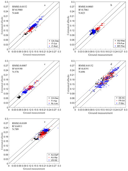 Figure 6 shows scatter plots of the estimated albedos and ground measurements. Different colors represent the three different sites for each land surface type.